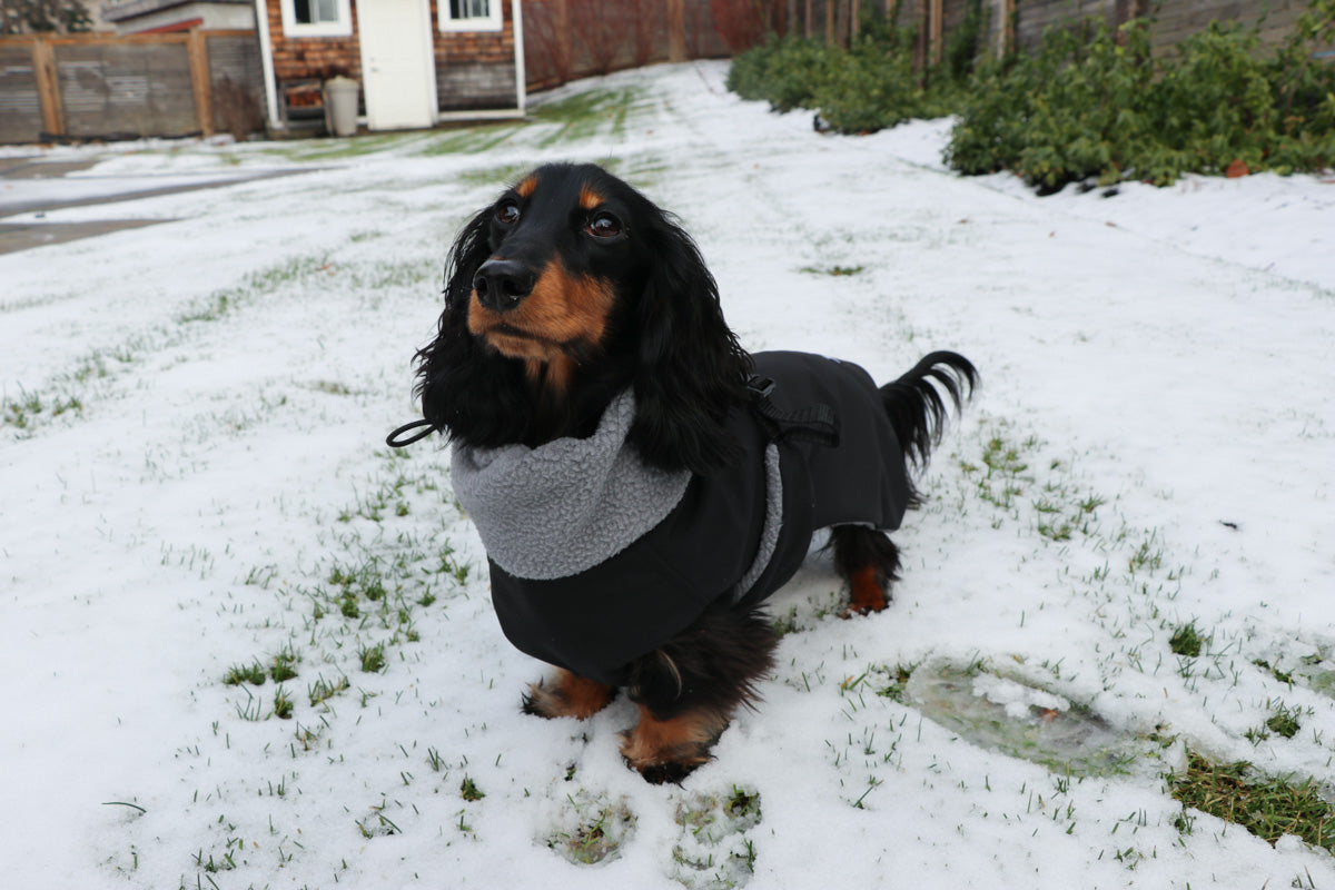 The winter jacket of your dachshund-centred-dreams. The outer shell is waterproof and windproof to keep your dog's body warm and dry in the snow or slush. Lined with thick, warm sherpa fleece to make sure your doxie stays as warm as possible for winters to come.