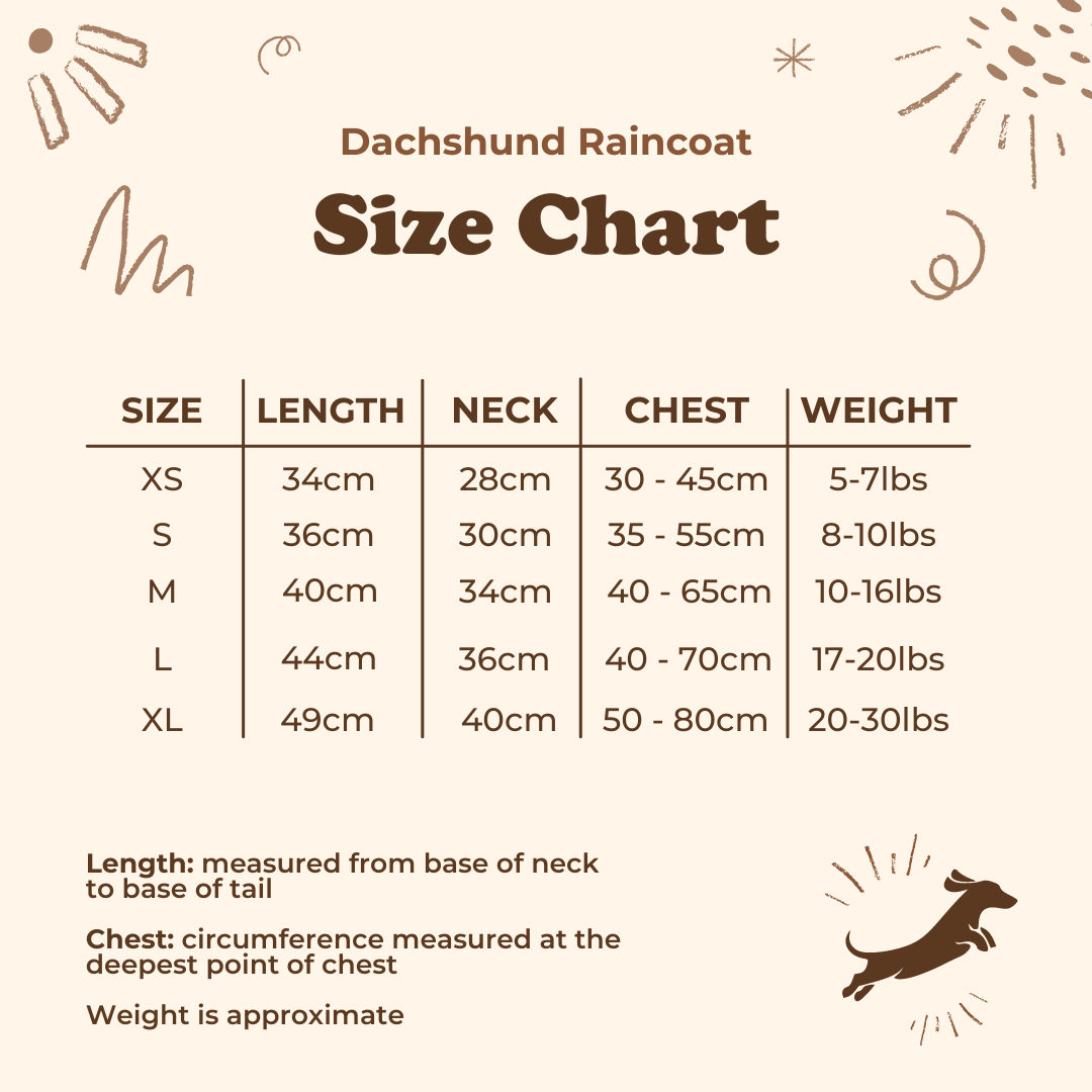 This raincoat is adjustable and each size accommodates a very wide range of dachshunds but please measure your dachshund before ordering using the dimensions size chart below to ensure that you order the size that will fit.