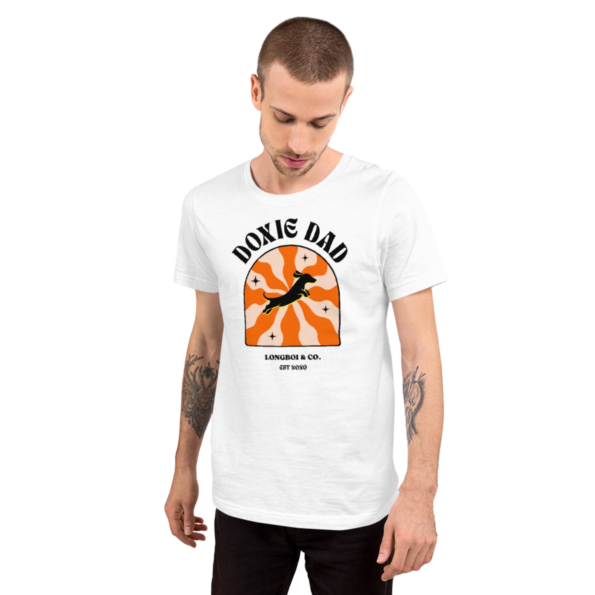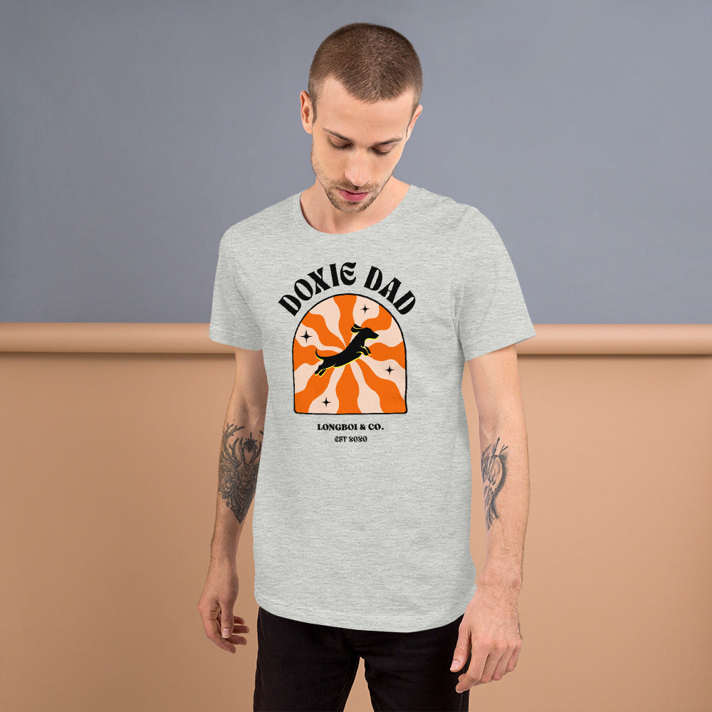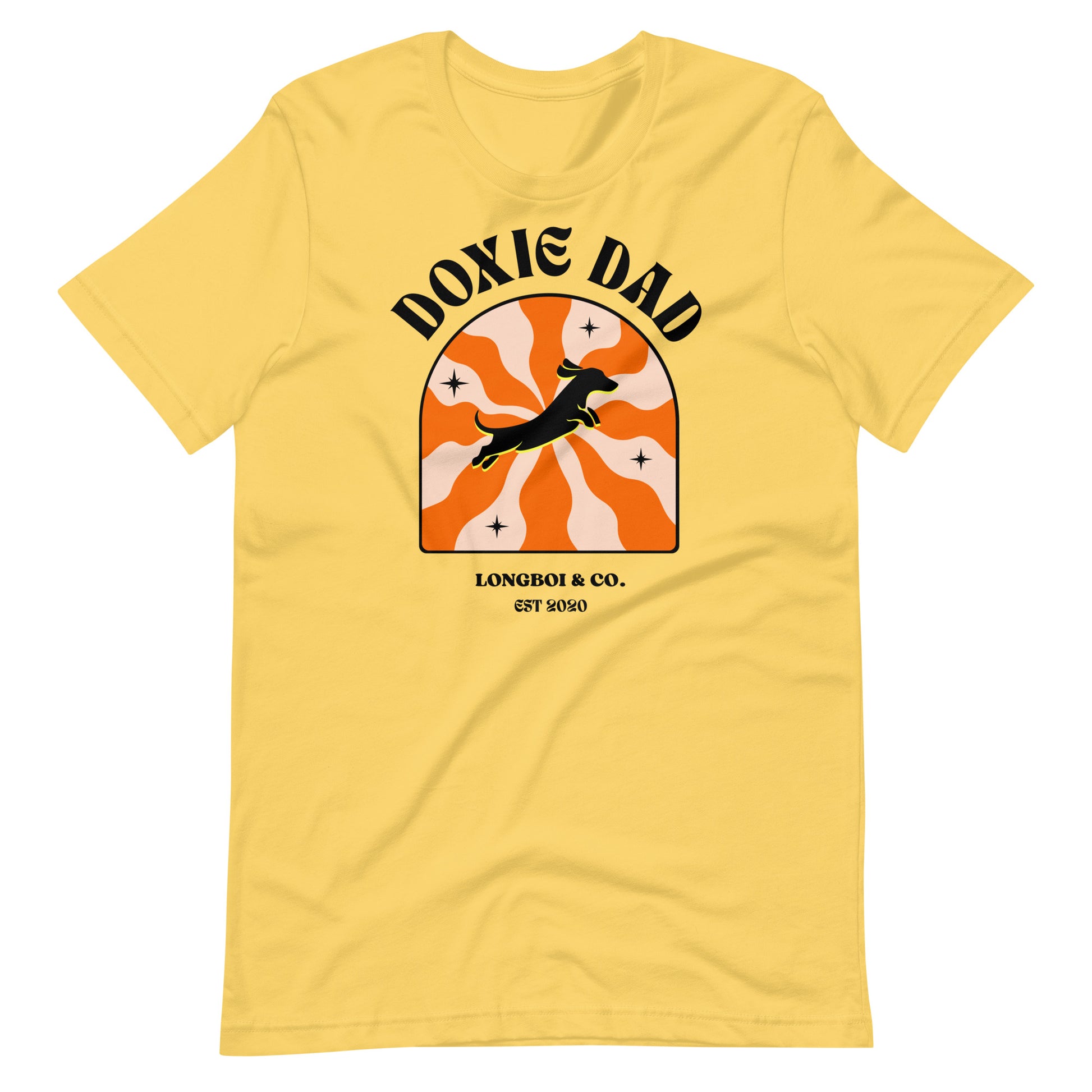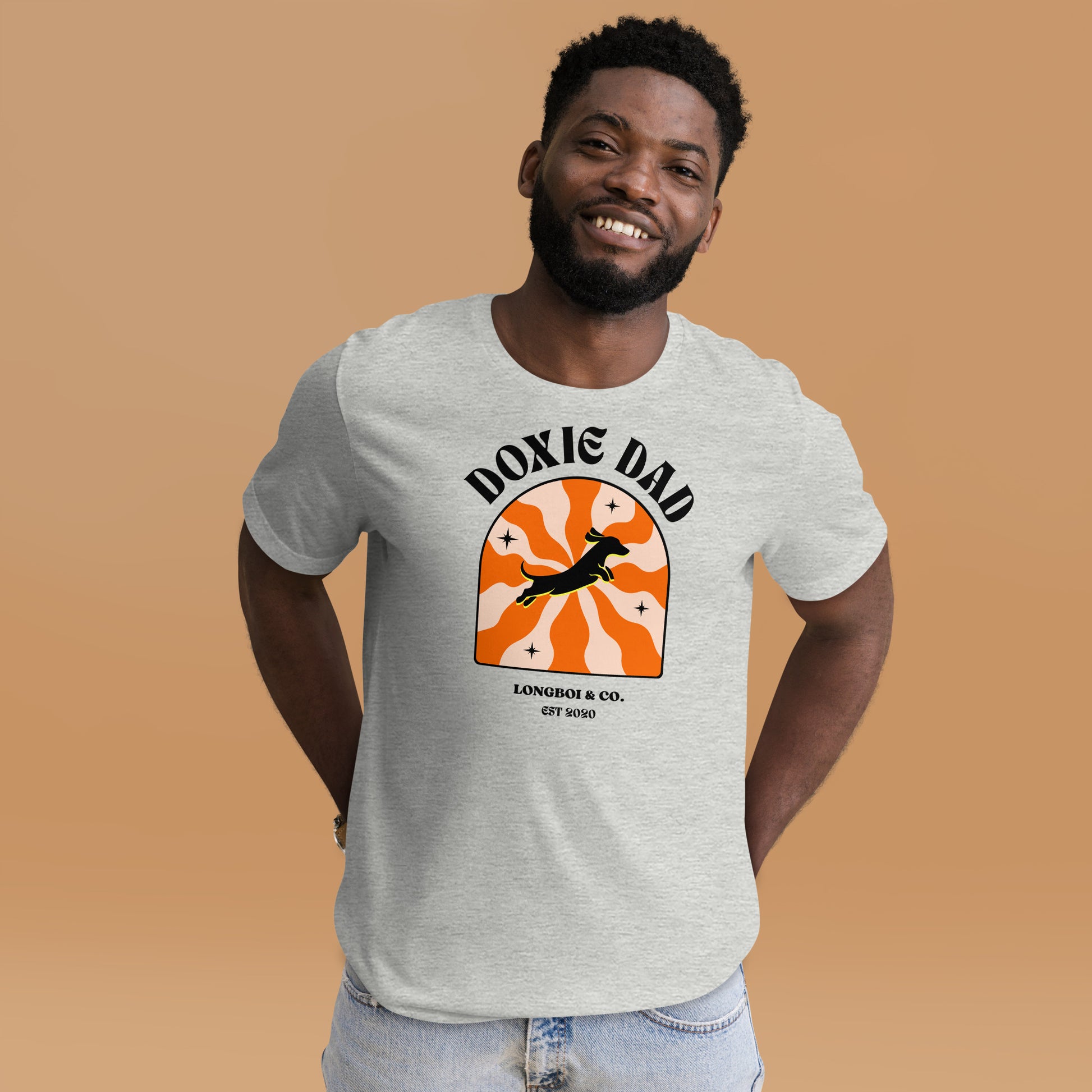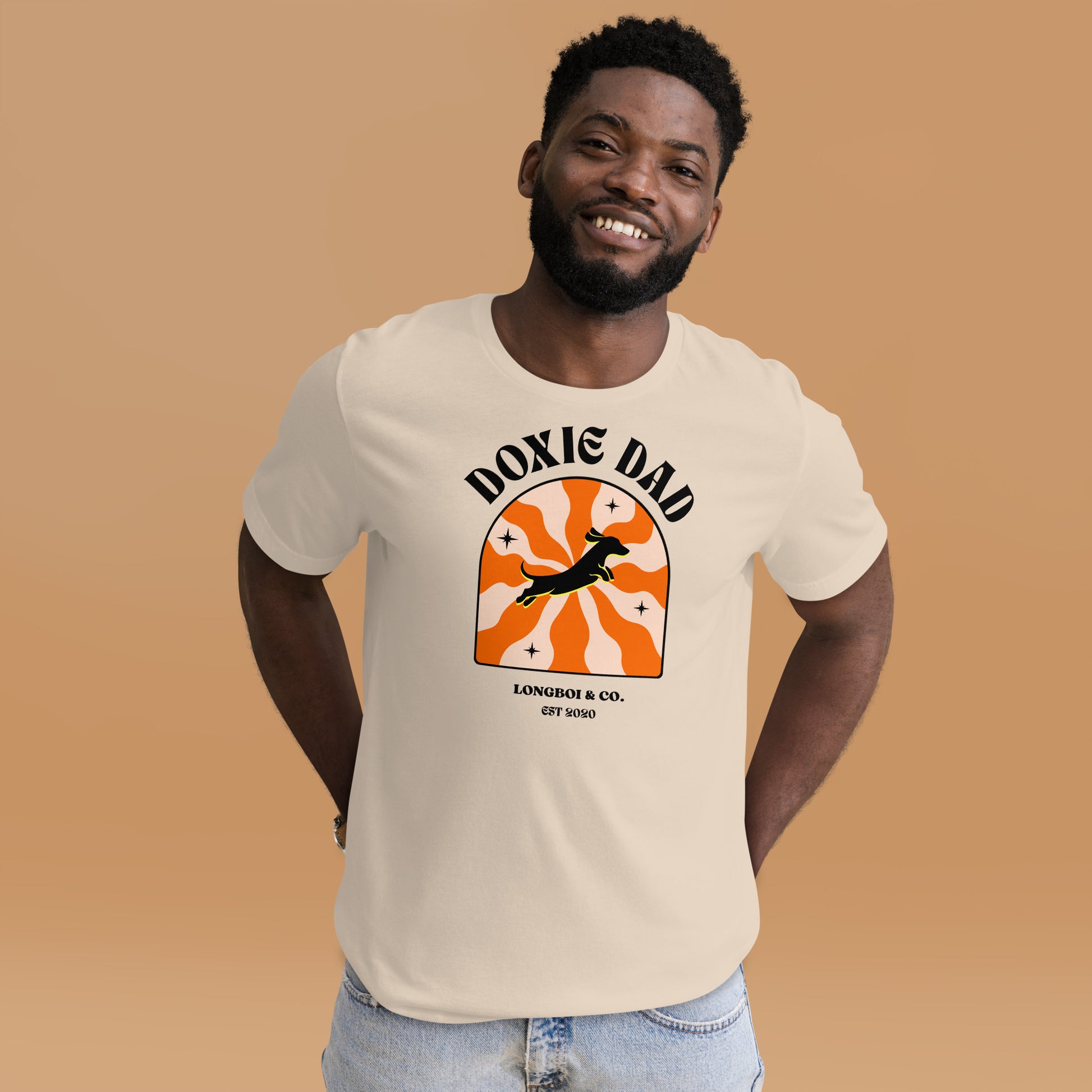 Be the trendiest dog dad with the Wavy Doxie Dad Tee! Don't just be a normal doxie dad, be a cool doxie dad! Using modern wavy lines and brilliant colors, this tee will show the world you don't mess around with your doxie dad status.
